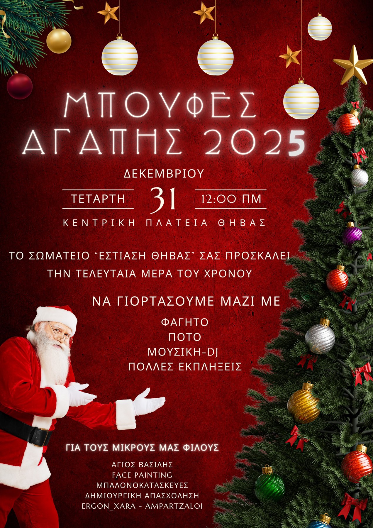 Νεα, Νέα – Ανακοινώσεις, Τα Νέα του Δήμου, Τα Νέα των Συλλόγων Μπουφές Αγάπης 2025 – Σωματείο “Εστίαση Θήβας” 31/12/2025 , 12:00 μ.μ., Κεντρική Πλατεία Θήβας Posted by dimosthivas 22/12/2025 On 22/12/2025