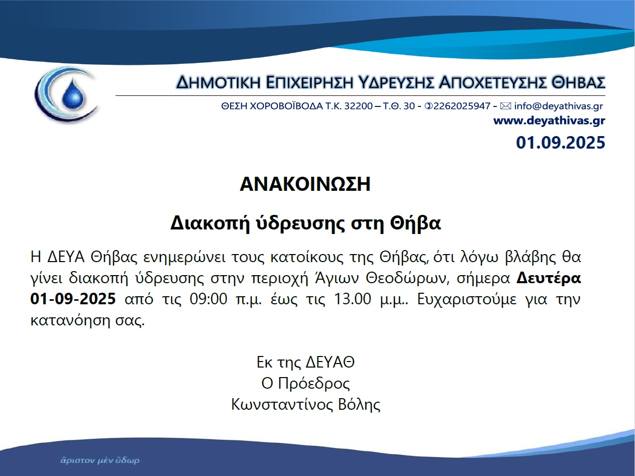 Ανακοινώσεις ΔΕΥΑΘ, Νεα, Νέα – Ανακοινώσεις Ανακοίνωση διακοπής υδροδότησης σήμερα στην περιοχή Αγίων Θεοδώρων Θήβας Posted by dimosthivas 01/09/2025 On 01/09/2025