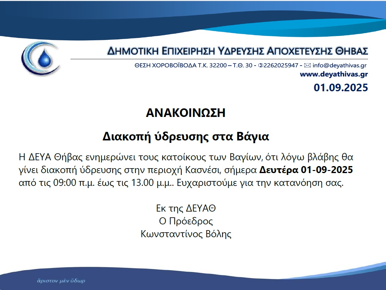 Ανακοίνωση διακοπής υδροδότησης 1&2 Σεπτεμβρίου στα Βάγια
