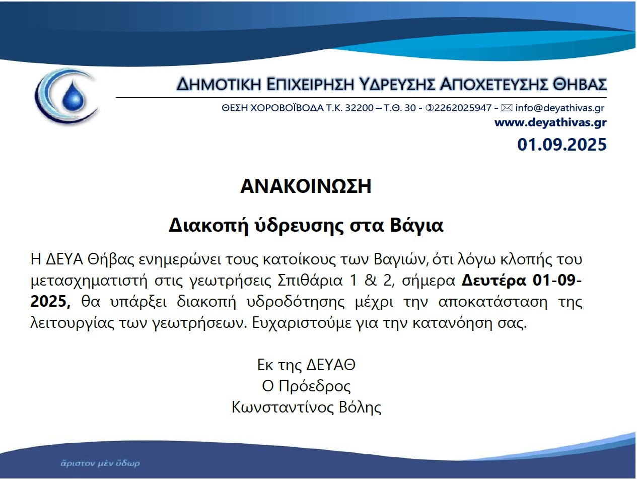 Ανακοινώσεις ΔΕΥΑΘ, Νεα, Νέα – Ανακοινώσεις Ανακοίνωση διακοπής υδροδότησης 1&2 Σεπτεμβρίου στα Βάγια Posted by dimosthivas 01/09/2025 On 01/09/2025