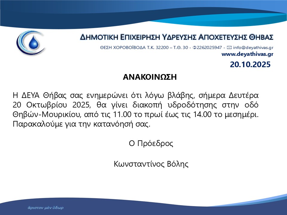 Διακοπή υδροδότησης στην οδό Θηβών – Μουρικίου