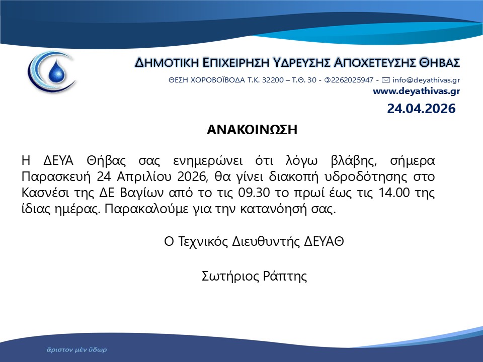 Kοινότητα Θήβας, Νεα, Νέα – Ανακοινώσεις, Τα Νέα του Δήμου, Τα Νέα των Συλλόγων Διακοπή υδροδότησης στο Κασνέσι (Βάγια) Posted by dimosthivas 24/04/2026 On 24/04/2026