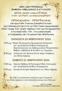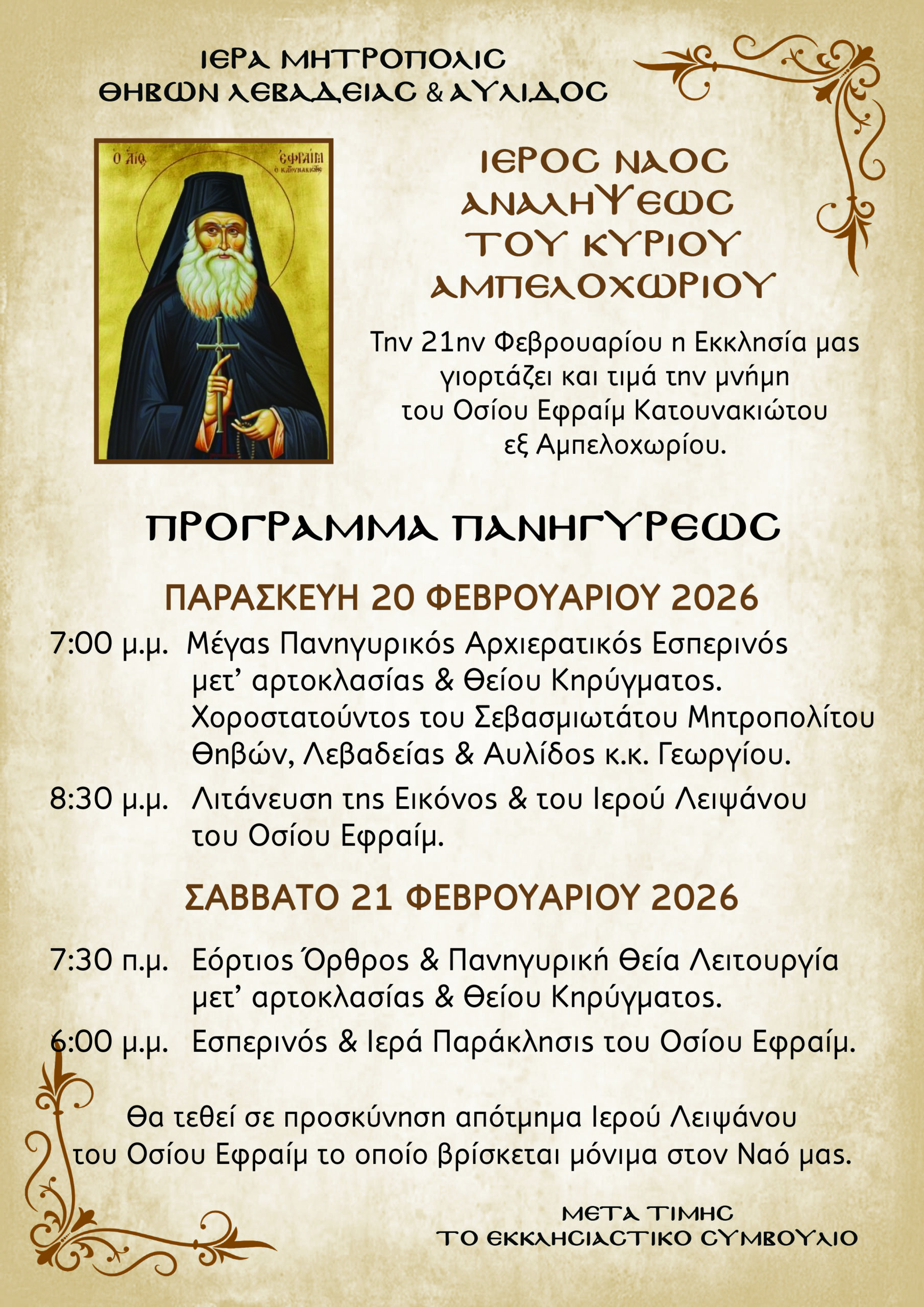 Νεα, Νέα – Ανακοινώσεις, Τα Νέα του Δήμου, Τα Νέα των Συλλόγων Πρόγραμμα Πανηγύρεως Ι.Ν. Αναλήψεως του Κυρίου Αμπελοχωρίου Θηβών Posted by dimosthivas 12/02/2026 On 12/02/2026