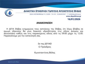 Την Πέμπτη 22 Ιανουαρίου 2026 και ώρα 11:00 π.μ., στην αίθουσα του Δημοτικού Συμβουλίου του Δήμου Θηβαίων, η «ΕΛΙΚΩΝΑΣ – ΠΑΡΝΑΣΣΟΣ Αναπ...