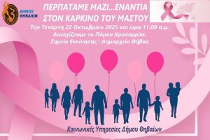 Ο Δήμος Θηβαίων μέσω των Κοινωνικών Υπηρεσιών του, διοργανώνει περίπατο στο Πάρκο Χρυσορρόα την Τετάρτη, 22 Οκτωβρίου 2025 και ώρα 11:0...