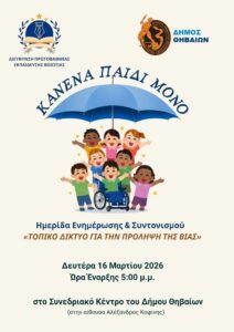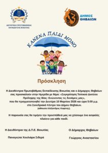 «Θωρακίζουμε τα παιδιά μας: Συνεργασία Πρωτοβάθμιας Εκπαίδευσης Βοιωτίας και Δήμων για την Πρόληψη της Βίας σε κάθε έκφανση της κοινωνικής ζωής»