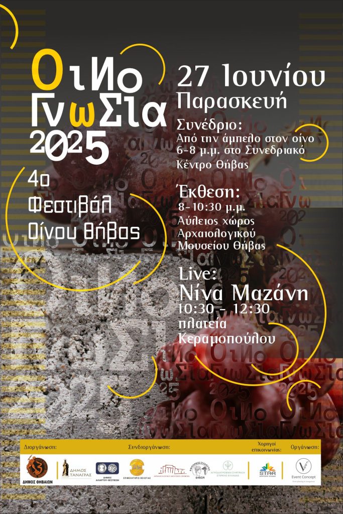 4o Φεστιβάλ Οίνου Θήβας : Παρασκευή, 27 Ιουνίου 2025 στον αύλειο χώρο του Αρχαιολογικού Μουσείου Θήβας