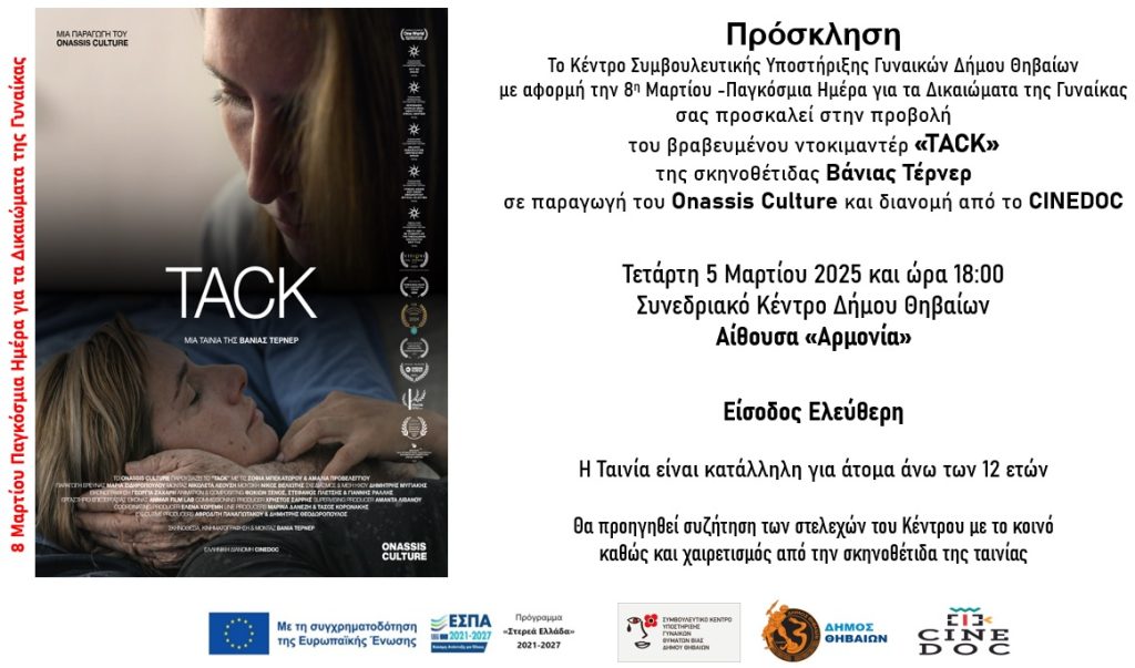 Κέντρο Συμβουλευτικής Υποστήριξης Γυναικών Δήμου Θηβαίων : Πρόσκληση στην προβολή του ντοκιμαντέρ “TACK” της Βάνιας Τέρνερ