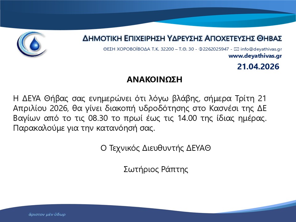 Ενόψει της έναρξης αντιπυρικής περιόδου 2026 (1η Μαϊου) παρακαλούνται οι δημότες του Δήμου Θηβαίων να μεριμνήσουν για τον καθαρισμό των...