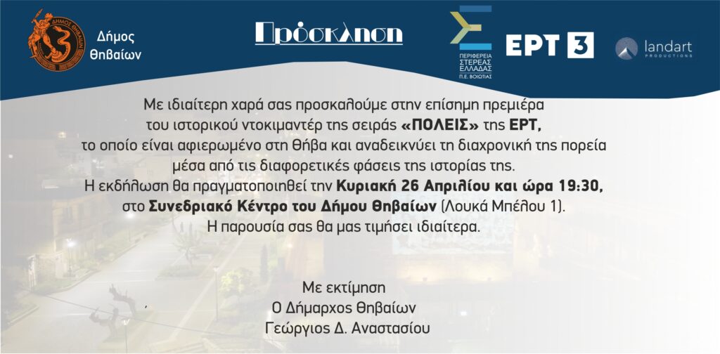 Η πόλη της Θήβας στην ΕΡΤ3 την Πέμπτη, 30 Απριλίου : Η σειρά ιστορικών ντοκιμαντέρ ΠΟΛΕΙΣ κάνει αφιέρωμα στη Θήβα