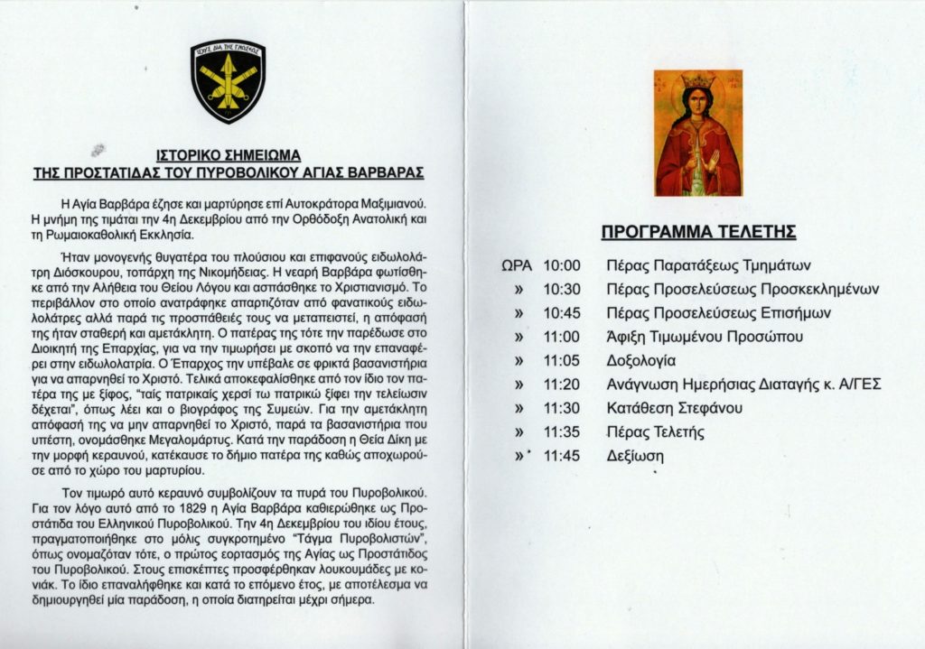 Το ΚΕΠΒ Θήβας εορτάζει στις 3 & 4 Δεκεμβρίου 2019 την Προστάτιδα του Πυροβολικού Μεγαλομάρτυρα Αγία Βαρβάρα.