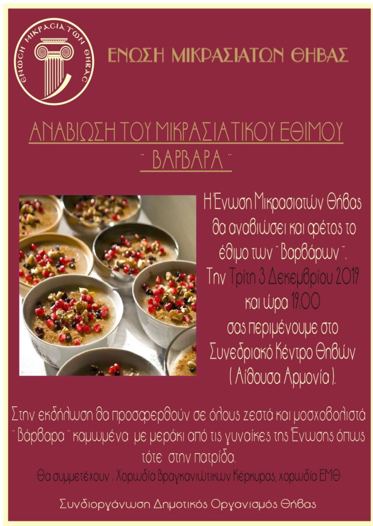 Το Δ.Σ. της Ένωσης Μικρασιατών Θήβας σας προσκαλεί στην αναβίωση του Μικρασιάτικου Εθίμου «ΒΑΡΒΑΡΑ»...