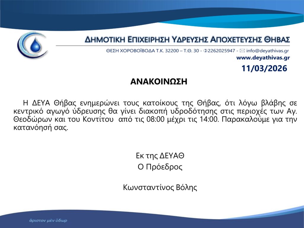 20 Feb 2026 Ανακοινώσεις ΔΕΥΑΘ, Νεα Διακοπή υδροδότησης στη Θήβα Posted by dimosthivas 20/02/2026 Περισσοτερα