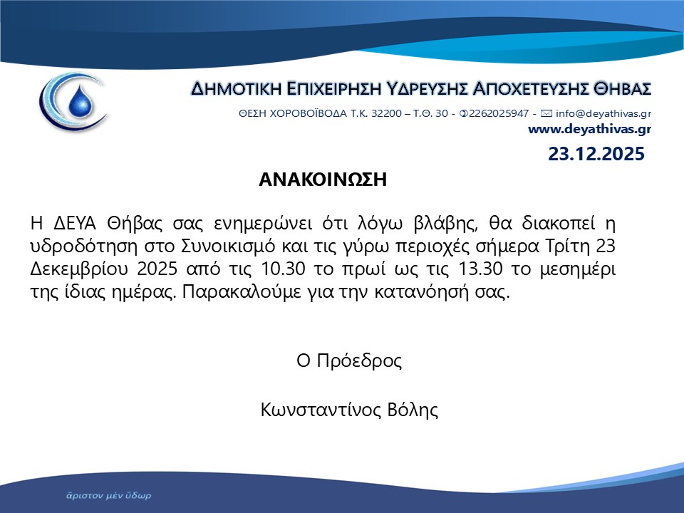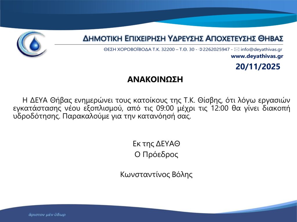 20 Nov 2025 Ανακοινώσεις ΔΕΥΑΘ, Νεα, Νέα – Ανακοινώσεις, Τα Νέα του Δήμου Ανακοίνωση διακοπής υδροδότησης στη Θίσβη Posted by dimosthivas 20/11/2025 Περισσοτερα