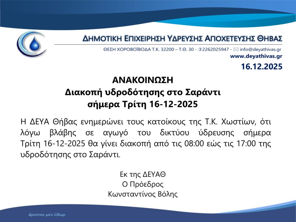 17 Dec 2025 Ανακοινώσεις ΔΕΥΑΘ, Νεα, Νέα – Ανακοινώσεις, Τα Νέα του Δήμου, Τα Νέα των Συλλόγων Ανακοίνωση διακοπής υδροδότησης στο Σαράντι Posted by dimosthivas 17/12/2025 Περισσοτερα