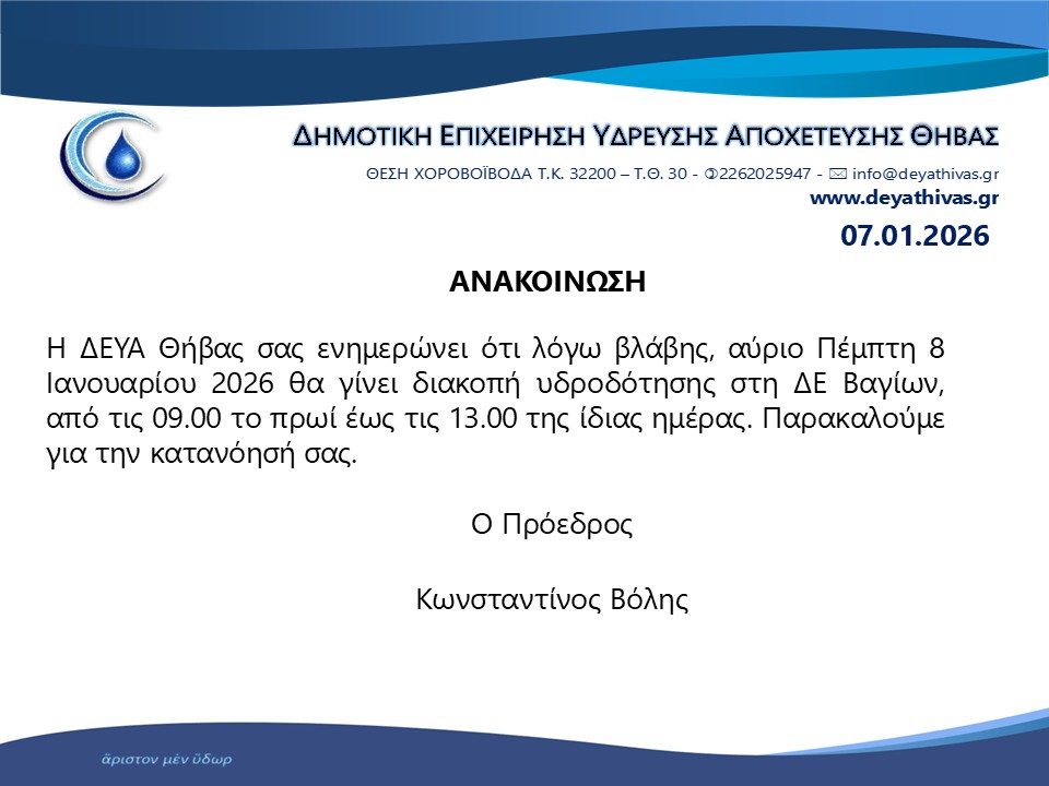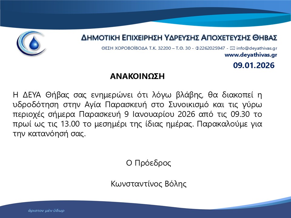 02 Feb 2026 Ανακοινώσεις ΔΕΥΑΘ, Νεα Διακοπή υδροδότησης 2/2/2026 Posted by dimosthivas 02/02/2026 Περισσοτερα