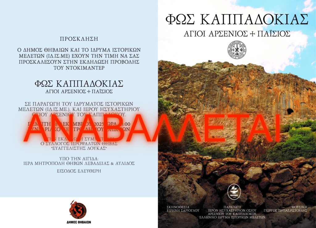 Ο Δήμος Θηβαίων ανακοινώνει την αναβολή της εκδήλωσης προβολής του ντοκιμαντέρ "ΦΩΣ ΚΑΠΠΑΔΟΚΙΑΣ: Άγιος Αρσένιος & Άγιος Παϊσιος" εξ...