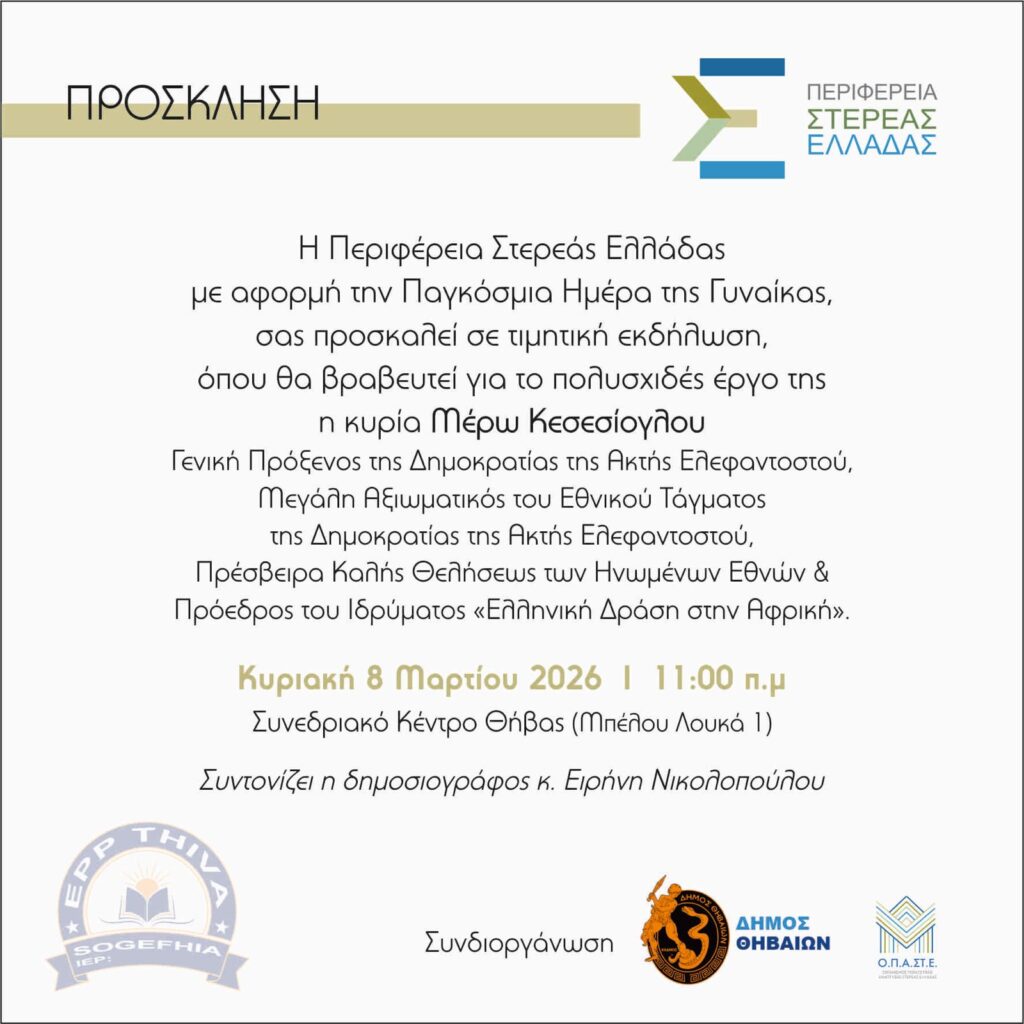 Η Περιφέρεια Στερεάς Ελλάδας σε συνδιοργάνωση με τον Δήμο Θηβαίων και το Ο.Π.Α.ΣΤ.Ε. με αφορμή την Παγκόσμια Ημέρα της Γυναίκας σας προ...