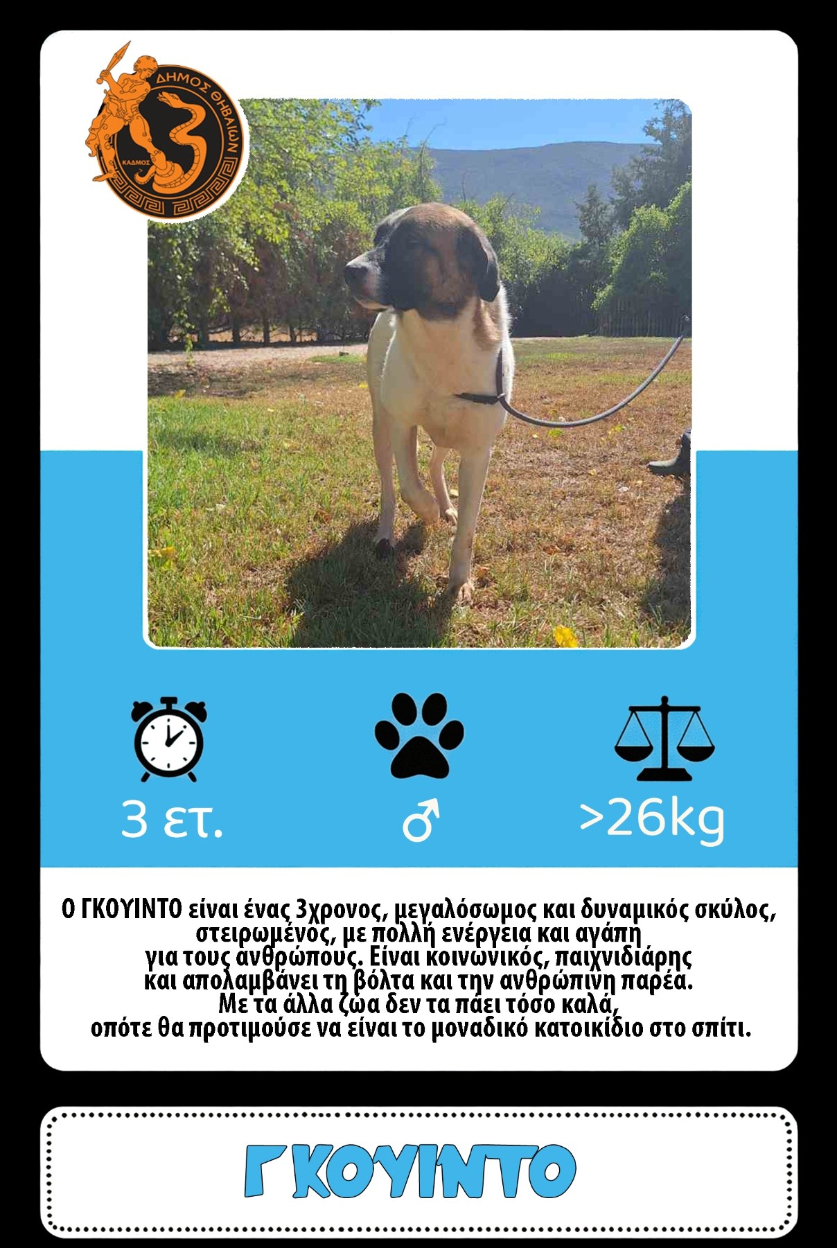 Ο Γκουίντο είναι ένας 3χρονος, μεγαλόσωμος και δυναμικός σκύλος, στειρωμένος, με πολλή ενέργεια και αγάπη για τους ανθρώπους.